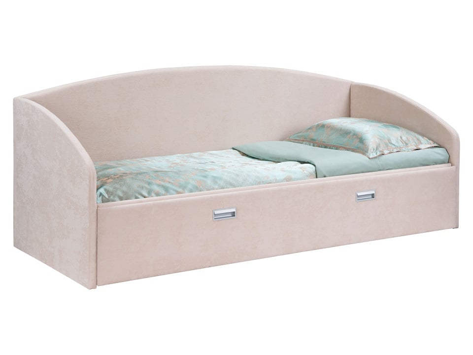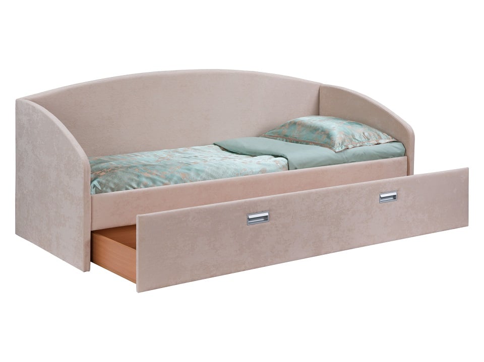 Модель выполнена из ДСП и ЛДСП. Обивка кровати имеет два варианта исполнения: из экокожи класса «Люкс» или из мебельной ткани. Обратите внимание, что обратная сторона изголовья также обита экокожей или мебельной тканью. Встроенное основание.
